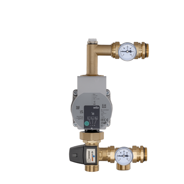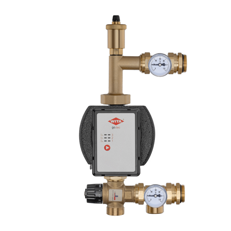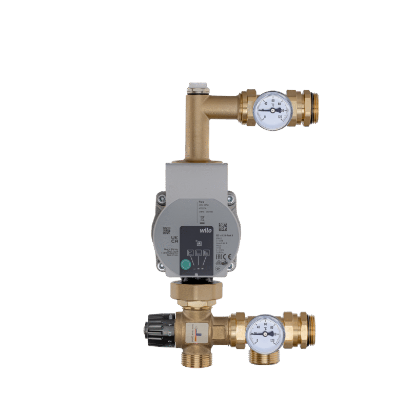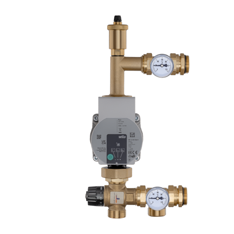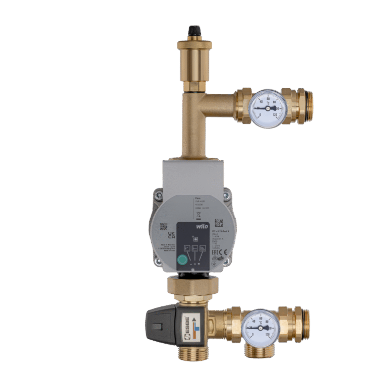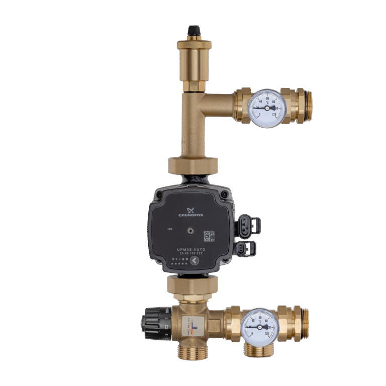 Mässingsblandningsset (blandningsgrupper) består av en cirkulationspump, en trevägsventil (bimetall), termometrar och en ventilationsventil.