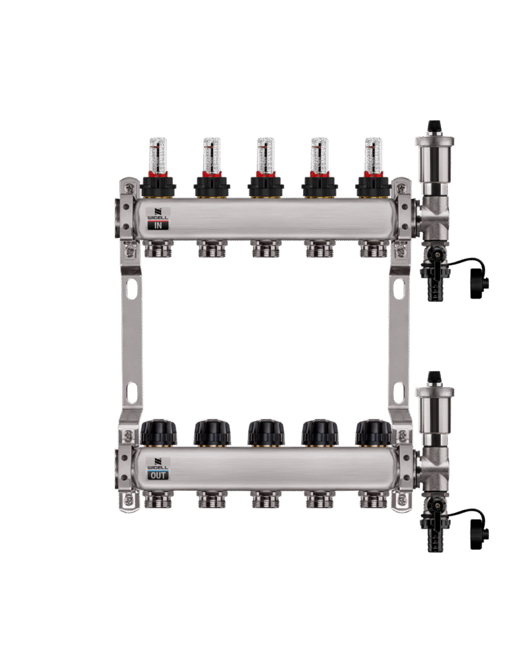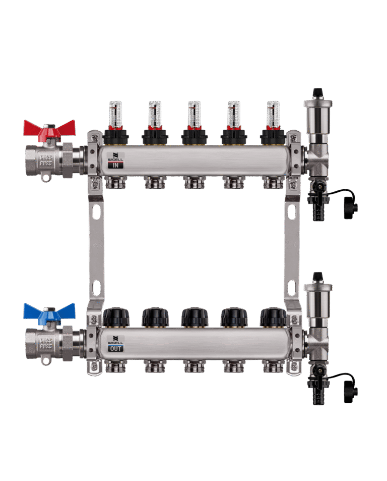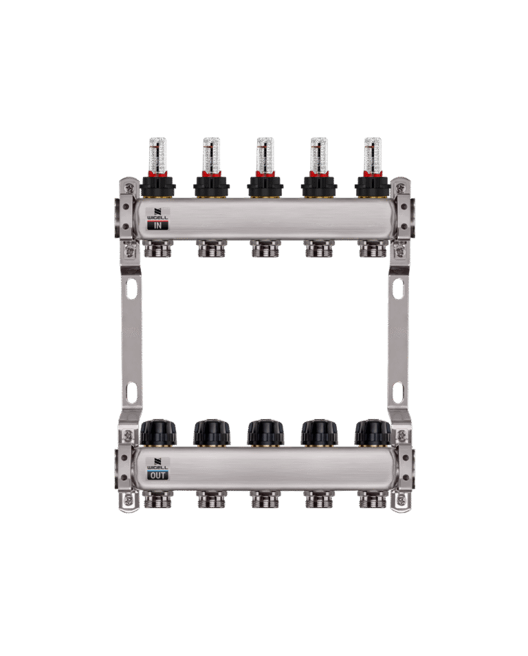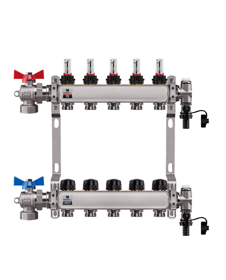 Manifolder för strålvärme, inklusive golvvärme, från WiRo- och Wirox-produktlinjerna tillverkade av CW617N av messingskvalitet i intervallet 2 till 18 kretsar.