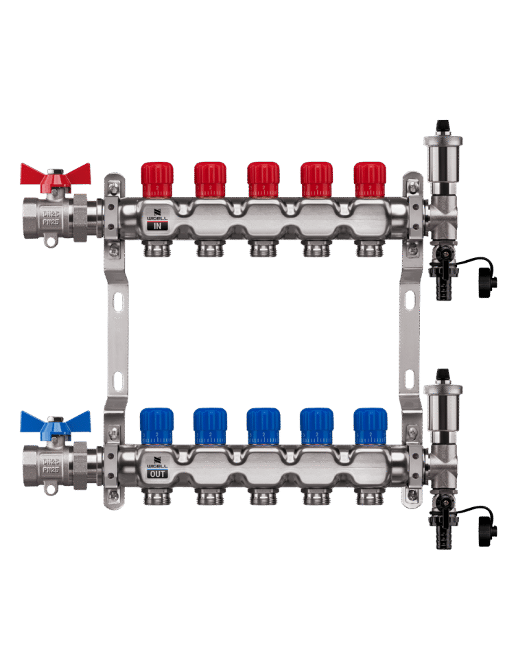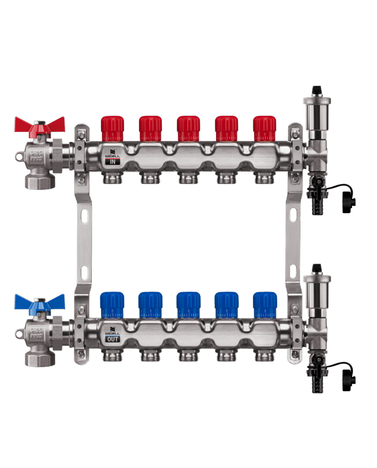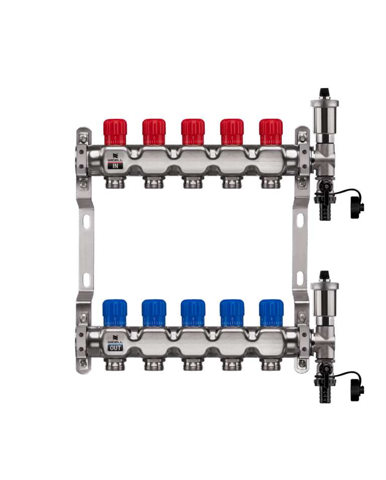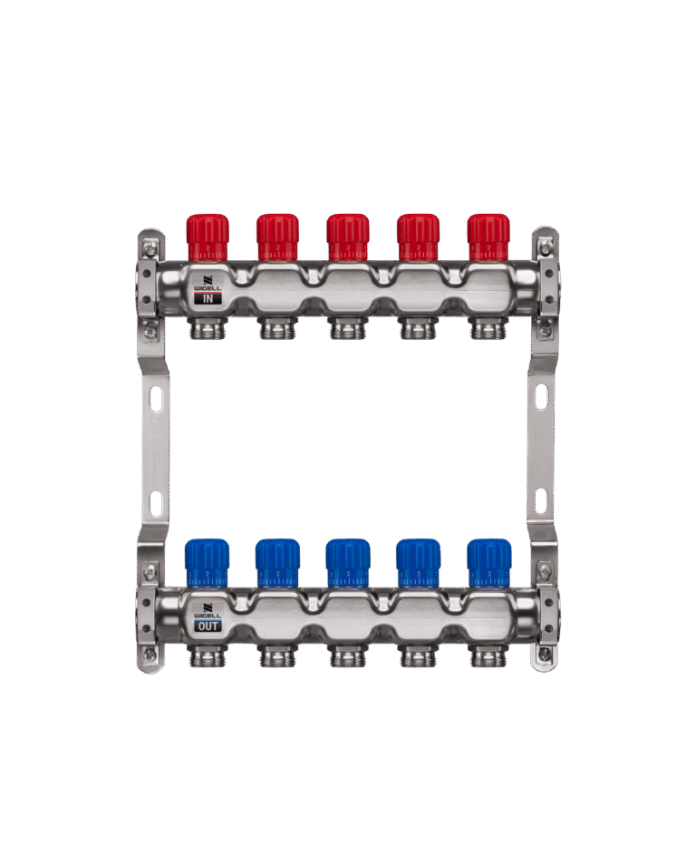 Distributörer för radiatoruppvärmning, WiRo-produktlinjen, tillverkas av messingskvaliteterna CW614N och CW617N och tillverkas i storlekar från 2 till 18 kretsar.