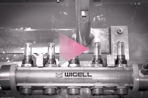 Läckagetest av mässingsbalk med golvmanifoldflödesmätare på en testbänk (tryck 8 bar).